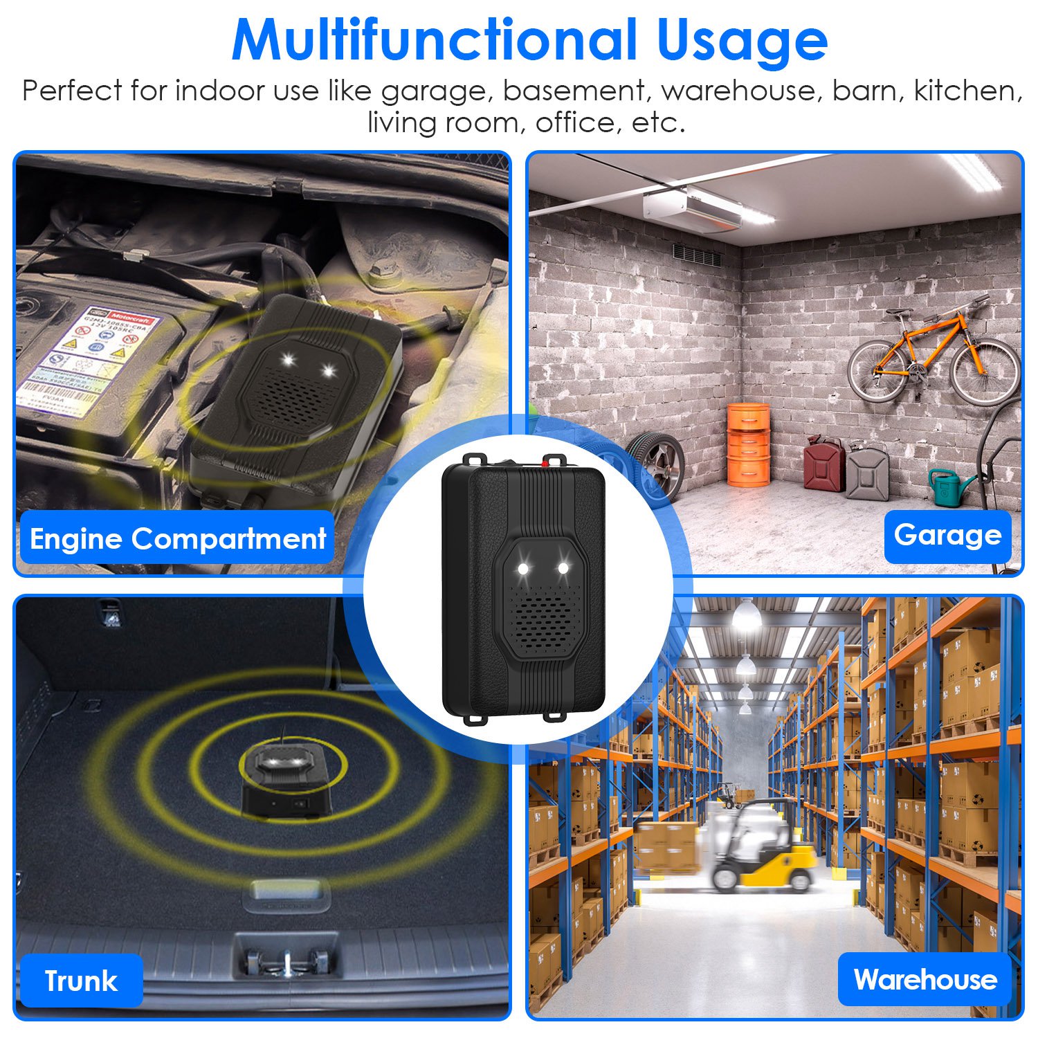 Say goodbye to nasty mice running around in the kitchen and basement, squirrels nesting in the car, mice biting the car wires! Try our under hood rodent repeller. Design with 18-36KHz fluctuating ultrasound and 2 white strobe lights to chase away mice, rats, wild cats, wild dogs, wild squirrels and other rodents. Automatically keeps standby when the car is started and resumes working after the car is parked. Can be powered by 4Pcs AA batteries(Not Included), DC5-12V vehicle power or adapter. No harm to human and pets. Suitable for car engine compartment, passenger compartment and trunk, garage, attic, basement, warehouse, barn, shed, living room etc..