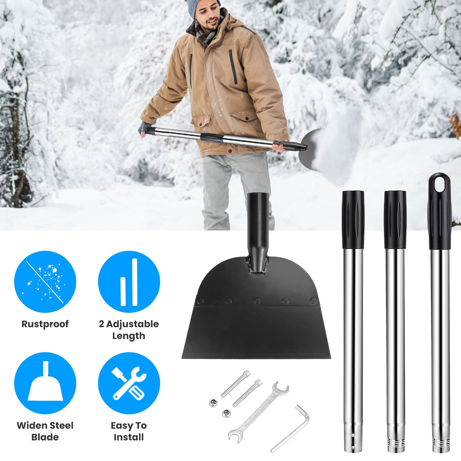 Constructed with 3 sections of rods, this easy-assemble flat snow shovel fits for people of varying heights and preferences. With widen size of 6.29x9.05in, high-strength manganese steel blade effortlessly penetrates through layers of snow, making shoveling a smoother process. From clearing icy pathways in winter to removing weeds, moss, and stubborn debris in other seasons, this shovel is a must-have tool for maintaining a tidy outdoor space year-round.