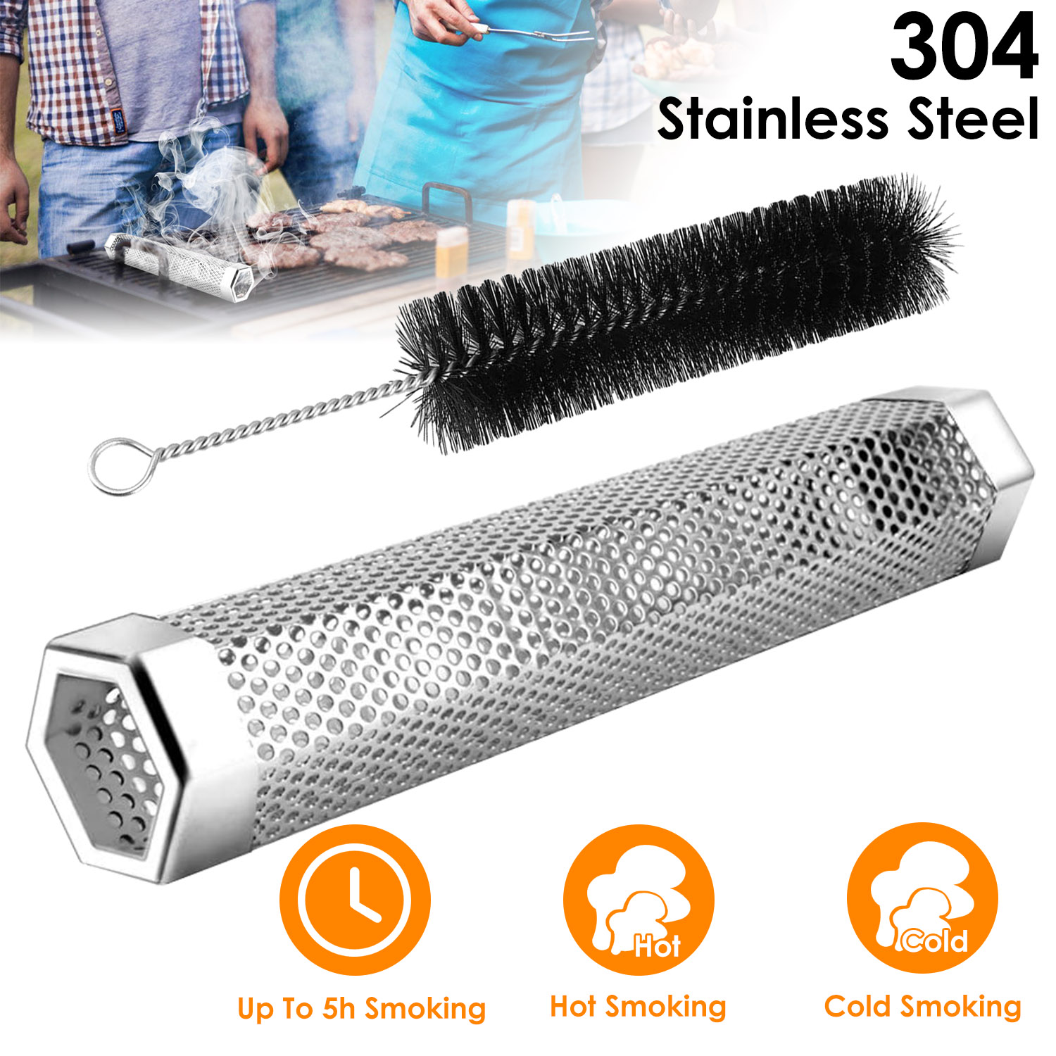 Our Pellet Smoker Tube is designed to work in any grill (gas, electric or charcoal), adding great flavor for your meat, fish, etc.. Adopting a new hexagonal shape, it will not fall or roll up easily. With 12in capacity and open cap in one side, it is easy to fill up enough pellets to provide constant smoke. Made from stainless steel, safe and durable. Extra cleaning brush makes it easy to clean the used Smoker Tube Pipe.