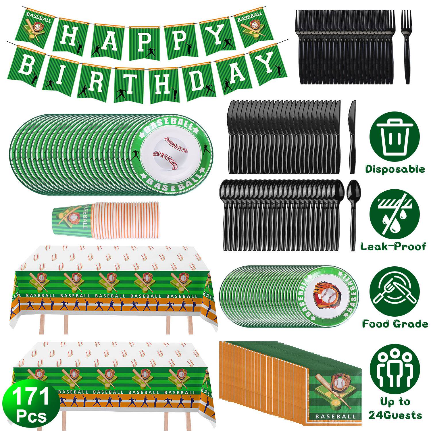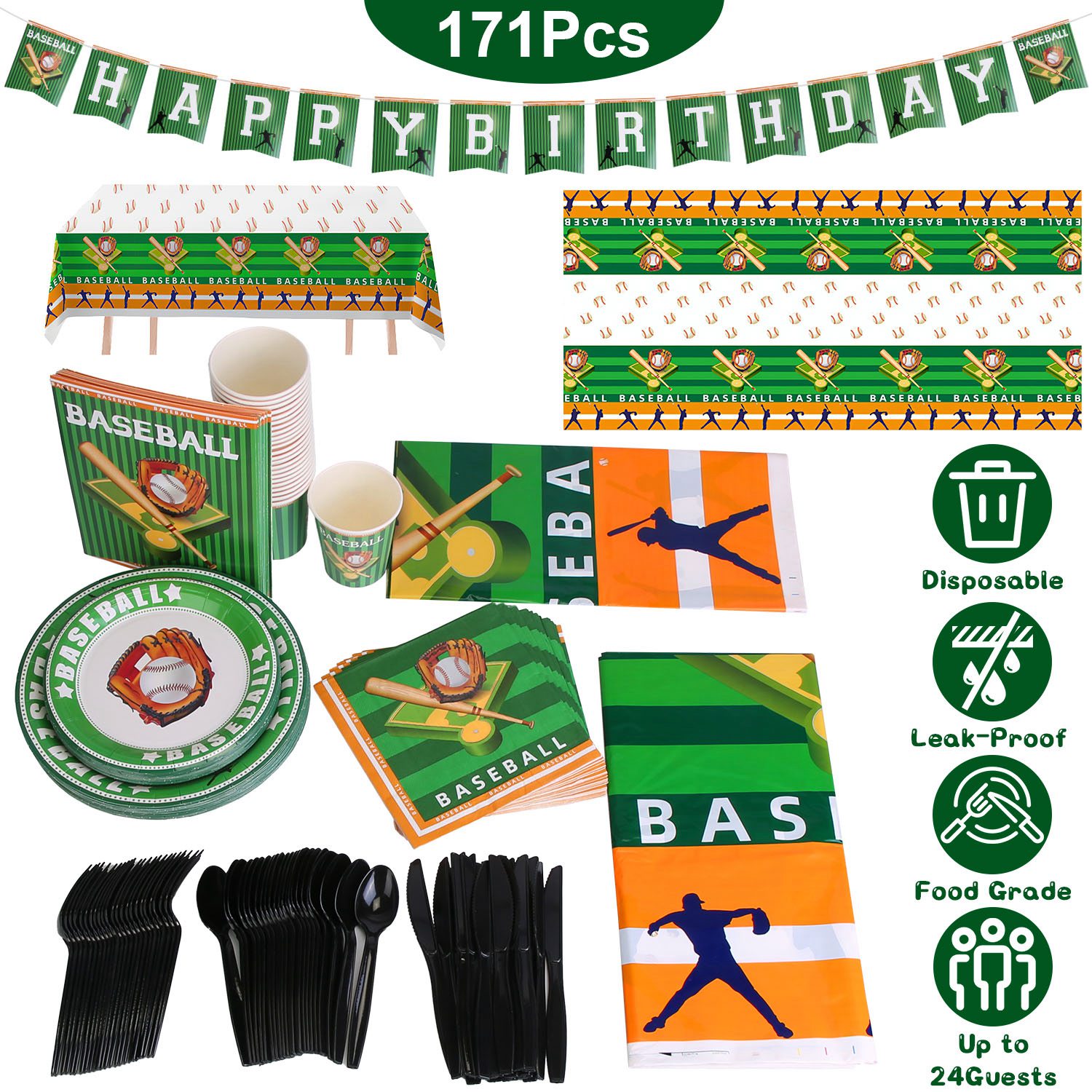 Our baseball party supplies set is designed with classic baseball patterns, adding enthusiastic, energetic and vibrant atmosphere for your various party. Food-graded thickened plastic and paper material has reliable strength and durability, won’t break or leak easily. 171Pcs Complete baseball themed tableware set includes all essentials to serve for up to 24 guests. A perfect choice to save your time and effort from laborious after-party cleaning jobs.