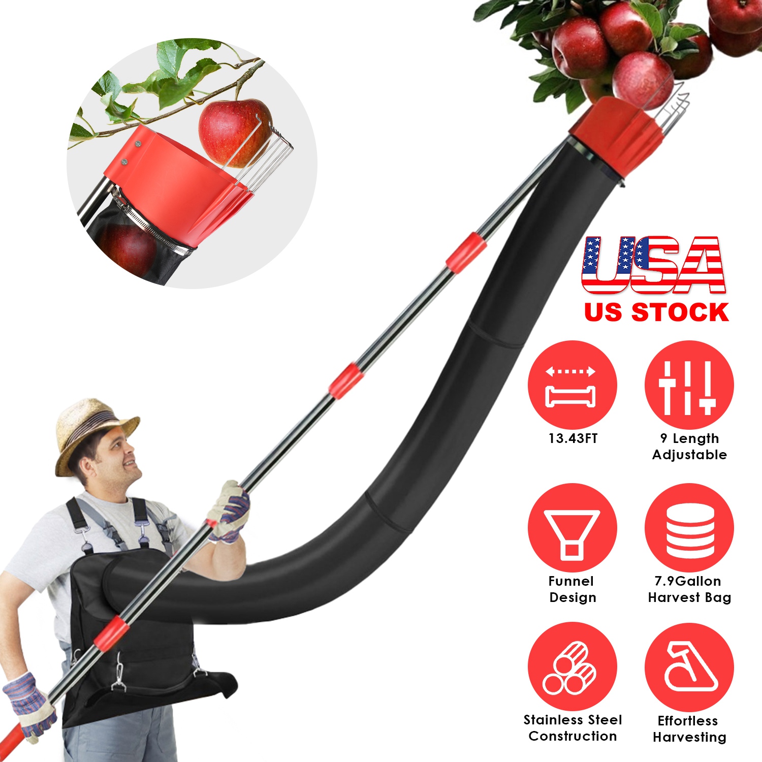 This fruit picker pole with harvest bag has a full length of up to 13.43ft, allowing you to effortlessly pick fruits from tall trees without using a ladder, transforming your fruit-picking experience. Feature 9 adjustable lengths from 2.62ft to 13.12ft, reaching fruits at different heights easily. The 7.9 gallon harvest bag and 6.57in basket diameter make it able to handle a variety of fruits with a diameter of less than 5.31inches. Constructed with solid stainless steel poles and oxford fabric collection bag, long-lasting for many seasons to come. We also provide 2 adjustable shoulder straps, making it easy and comfortable for you to carry the bag while picking fruits. If you\'re a home gardener or a professional grower, this tool is a must-have for your harvesting needs!